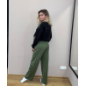 Kelnės – tiesaus, šiek tiek platesnio kirpimo, su juostomis šonuose. Šis kirpimas nevaržo judesių ir suteikia elegancijos. Liemuo su guma ir su raišteliais, turi šonines kišenes. Audinys malonus kūnui, tinkamas tiek kasdieniam dėvėjimui, tiek aktyviam poilsiui.