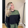 Džemperis — divu krāsu, brīvs un nedaudz īsāks, ar apaļu izgriezumu. Garās piedurknes ar nedaudz nolaistiem pleciem nodrošina ērtumu un kustību brīvību.
