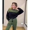 Худи — двухцветное, свободного и слегка укороченного кроя, с круглым вырезом. Длинные рукава с немного опущенной линией плеч обеспечивают удобство и свободу движений.